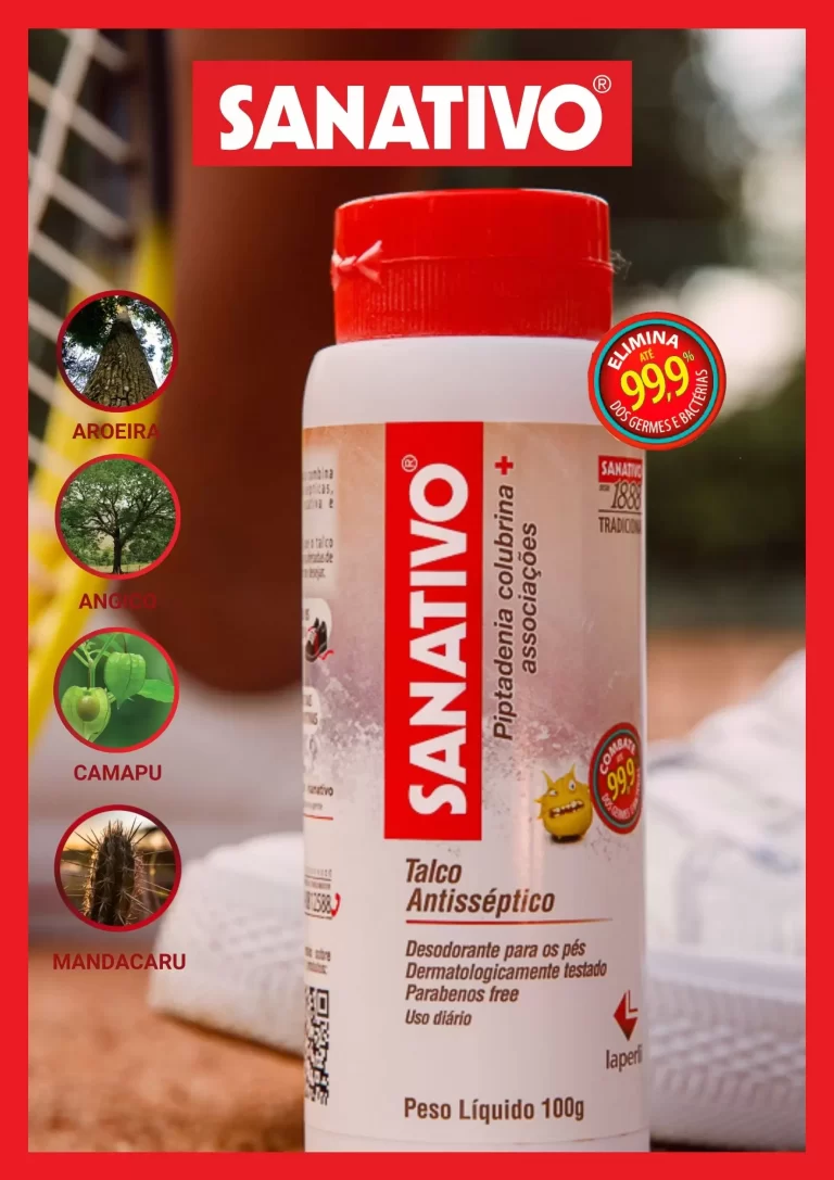 Aplique o talco SANATIVO® sobre as áreas afetadas de 2 a 3 vezes ao dia ou conforme desejar.